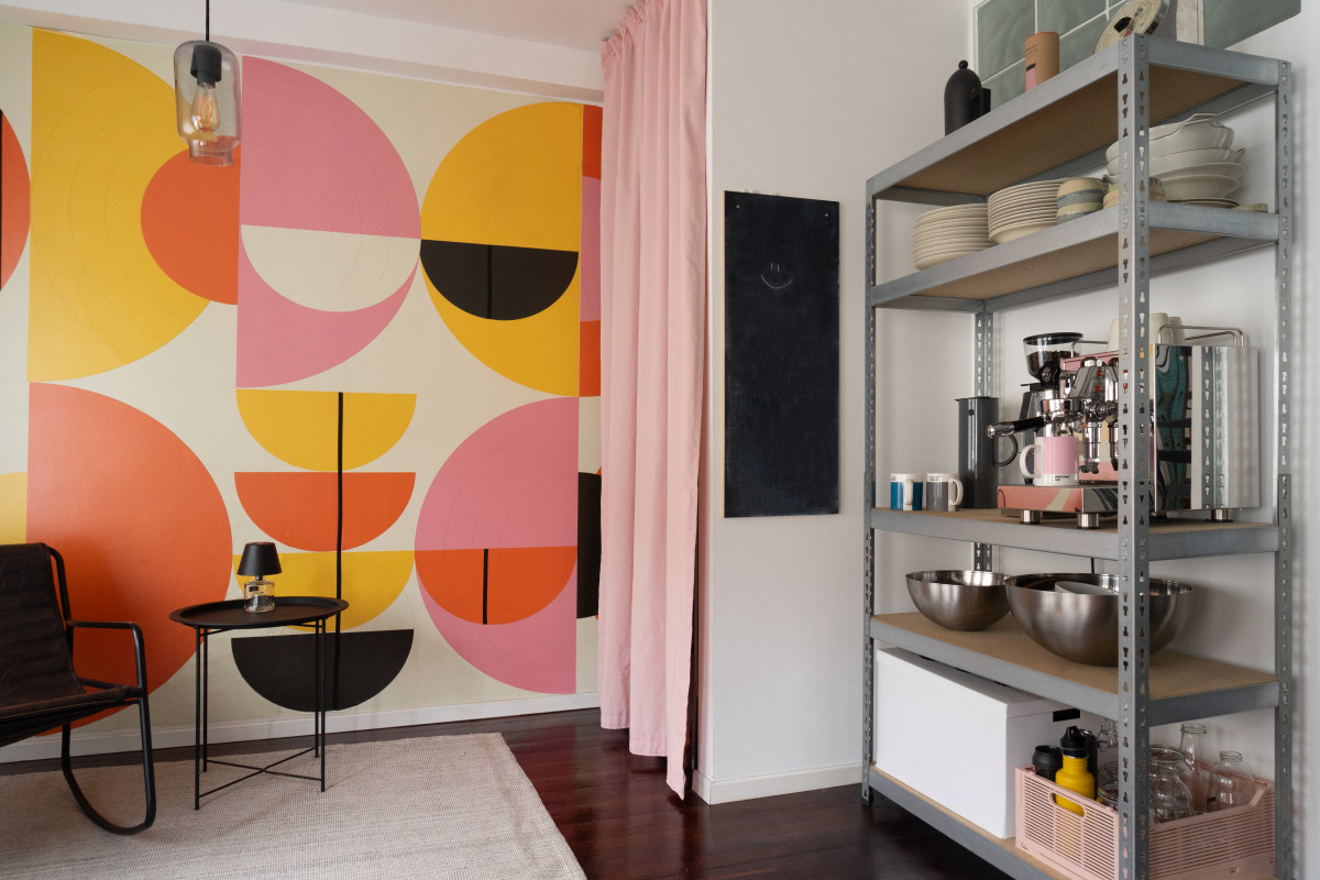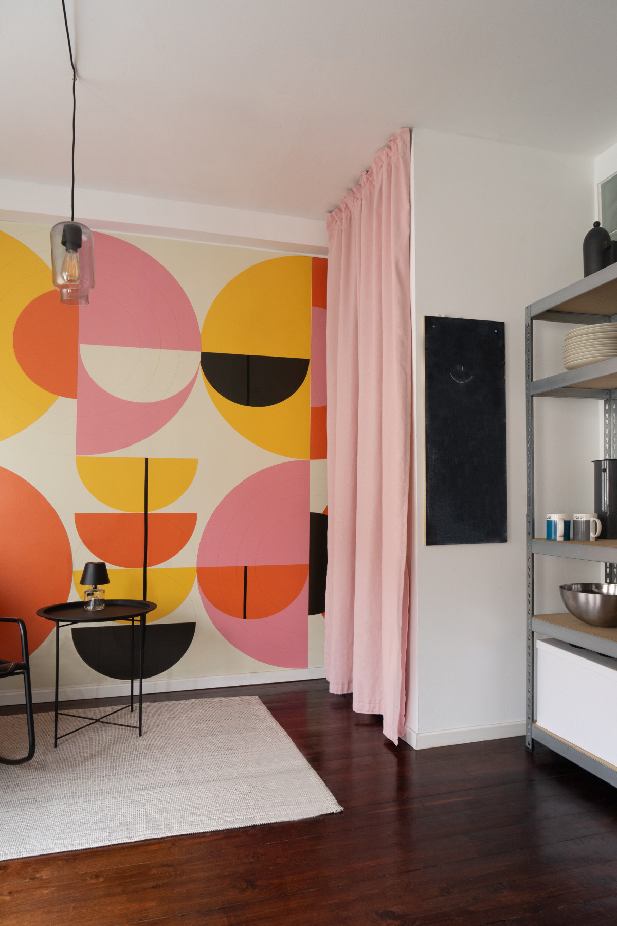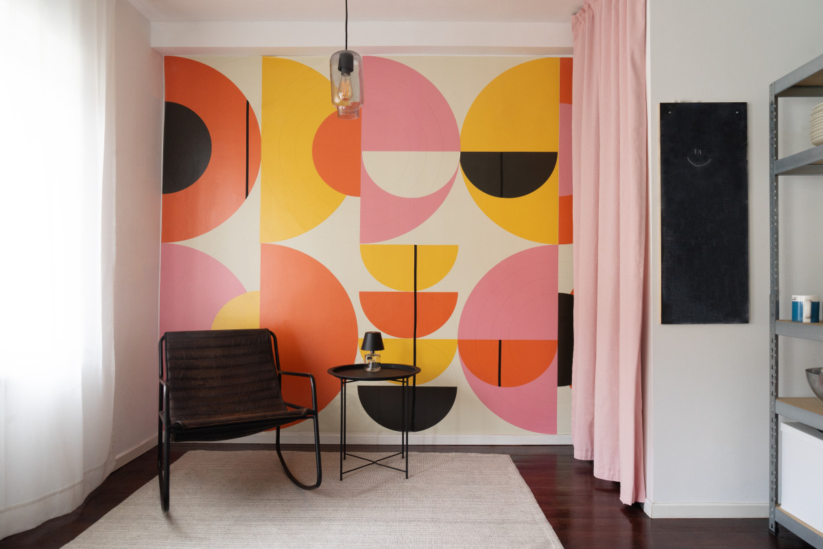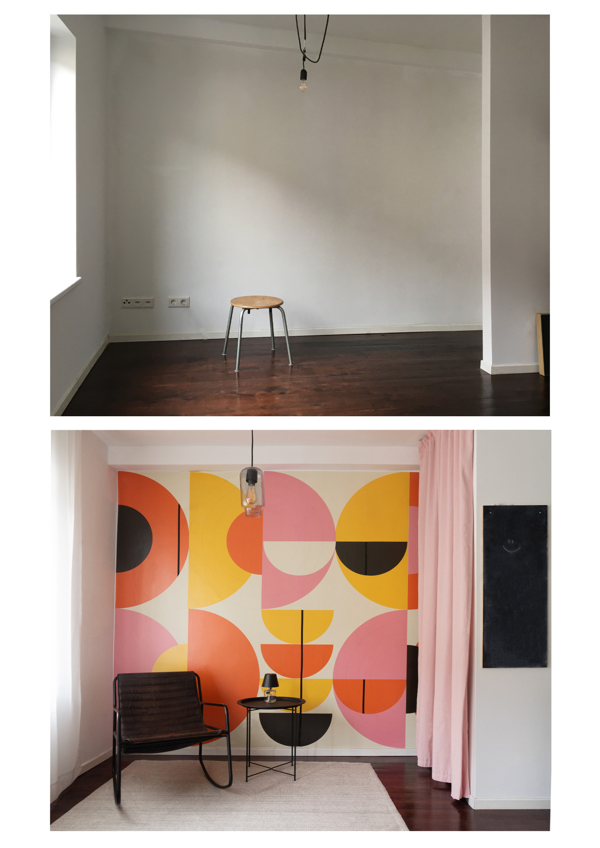 Gestaltung der "kalten Ecke" in einem Bremer Haus. Große geometrische Muster lassen den Raum größer und höher wirken und sorgen für einen Hingucker in der Wohnung. Passend dazu fügt sich das minimalistische Mobiliar ein und stellt einen Gegenpol zum Bunten dar.